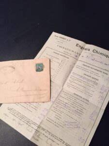 One day Fisher found an envelope sitting on the dusty floor looking for all the world as though someone had just put it there a moment ago. When we examined it and its contents we discovered it to be a price list dating back to 1897. It is in perfect condition and must somehow have stayed dry over the last 120 years. It summarises the cost of chemical preparations for vineyards and wine making and was sent by a company called Erasme Simonnot who’s address was Quai d’Orient, Cette. Now we know a town called Sète and when I googled the company I discovered that Cette and Sète are one and the same so we are off to try to discover more about this company.